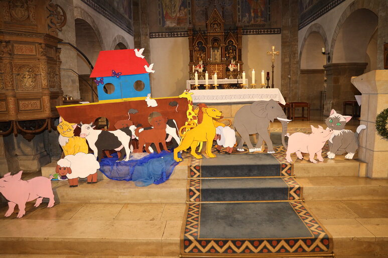 Für den Familiengottesdienst in der Pfarrkirche St. Nikolaus hatten die Kinder liebevoll gestaltete Tiere für die Arche Noah gebastelt. Foto: Carola Drabon